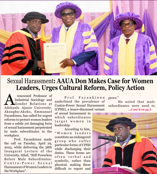 A renowned professor of Industrial Sociology and Gender Relations at Adekunle Ajasin University, Akungba-Akoko, Emmanuel Fayankinnu, has called for urgent reforms to protect women leaders from a subtle yet damaging form of sexual harassment perpetrated by male subordinates in the workplace